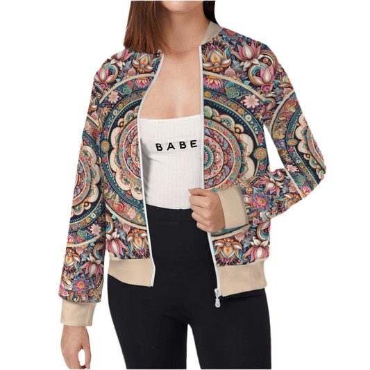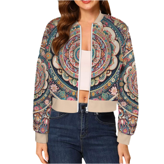 Mandala Casual Long Sleeve Zip-Up Bomber Jacket (short waist)