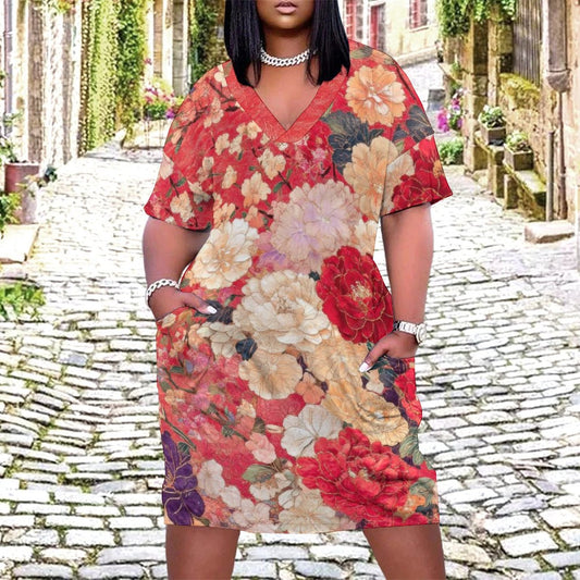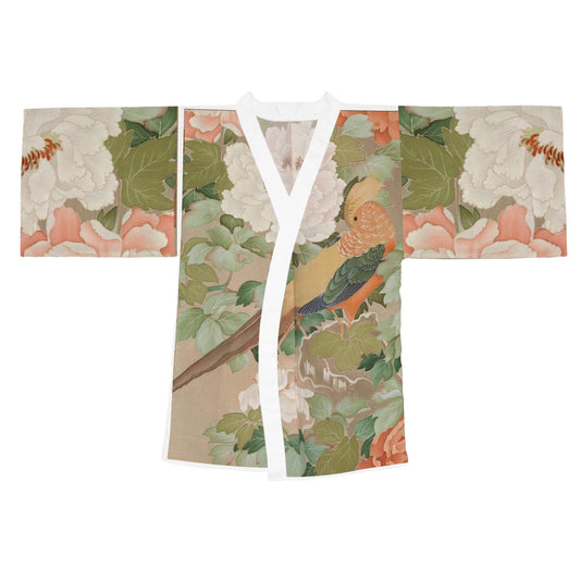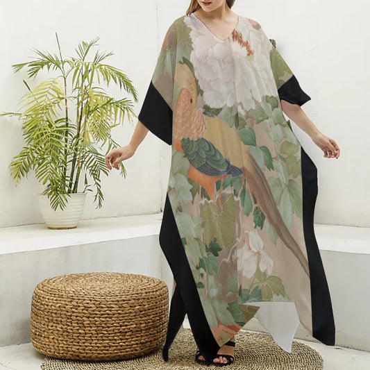 Early 19th Century Kimono, Pheasants amid Peonies-Authentic 19th Century Japanese Kimono Print on Women's Imitation Silk V-neck Kaftan Robe