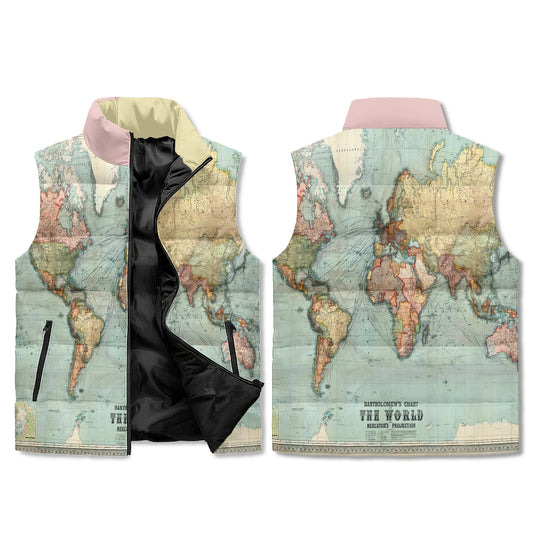 Bartholomews Chart of the World on Mercators Projection (1914), Unisex Lightweight Stand Collar Zip Up Puffer Vest