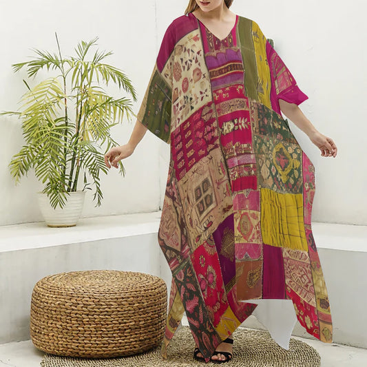 Indian Silk Patchwork Women's Imitation Silk V-neck Kaftan Robe