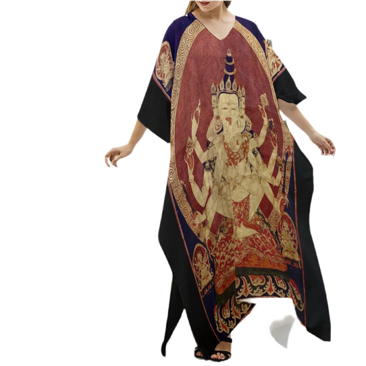 17th Century (1650) Tibeten Thanka of Guhyasamaja Akshobhyavajra, Women's Imitation Silk V-neck Kaftan Robe