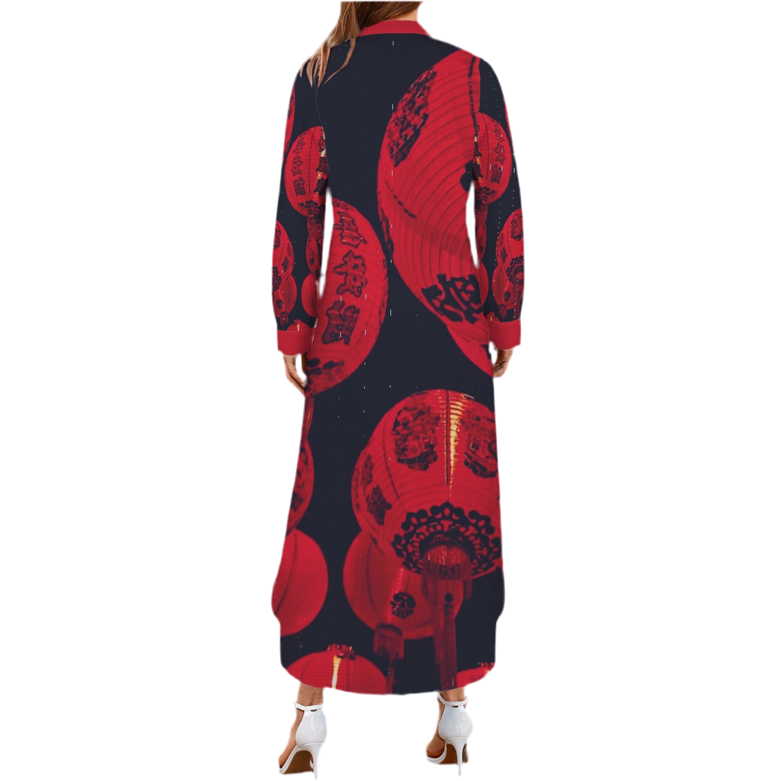 Red Chinese Lantern Women's Button Long Sleeve Shirt Dress