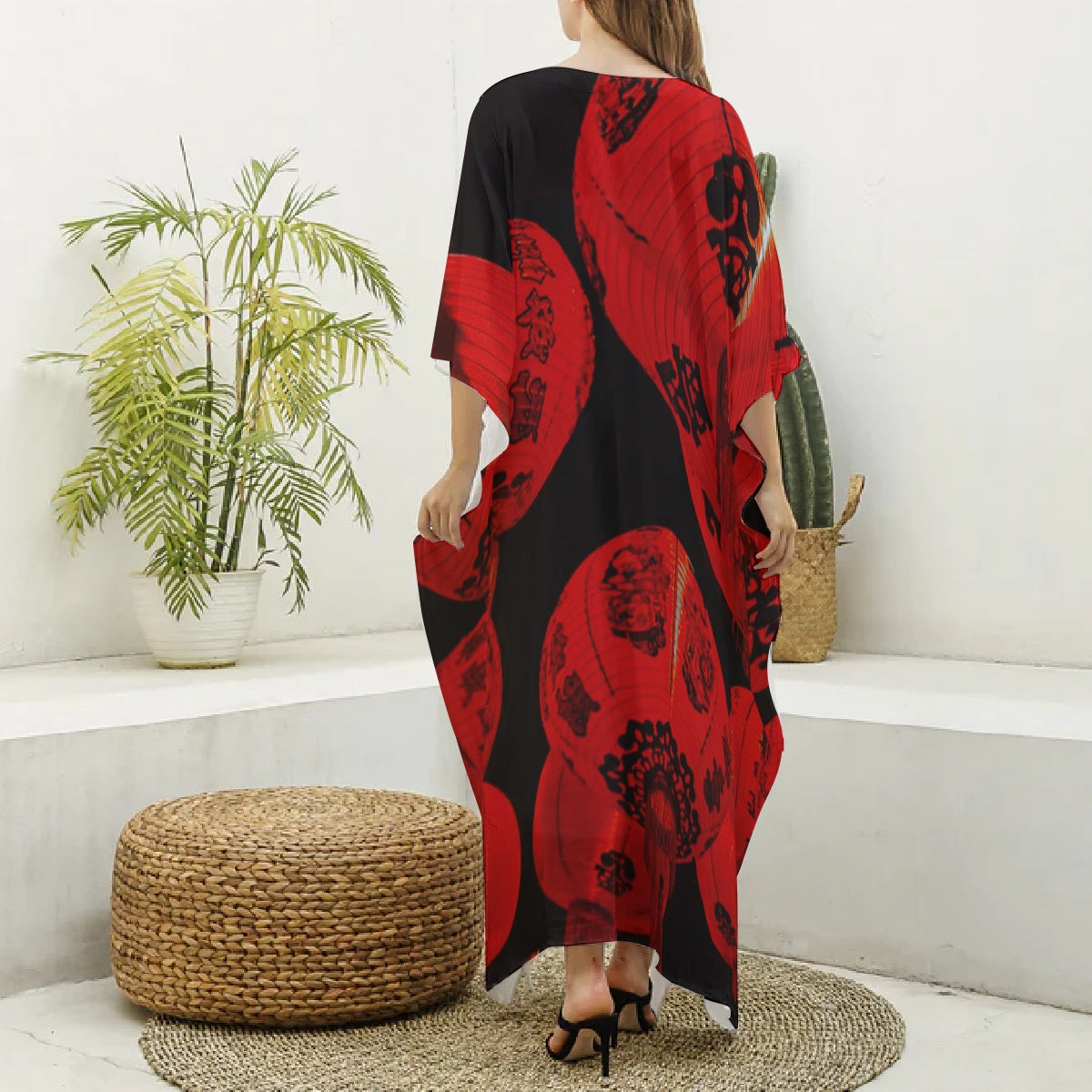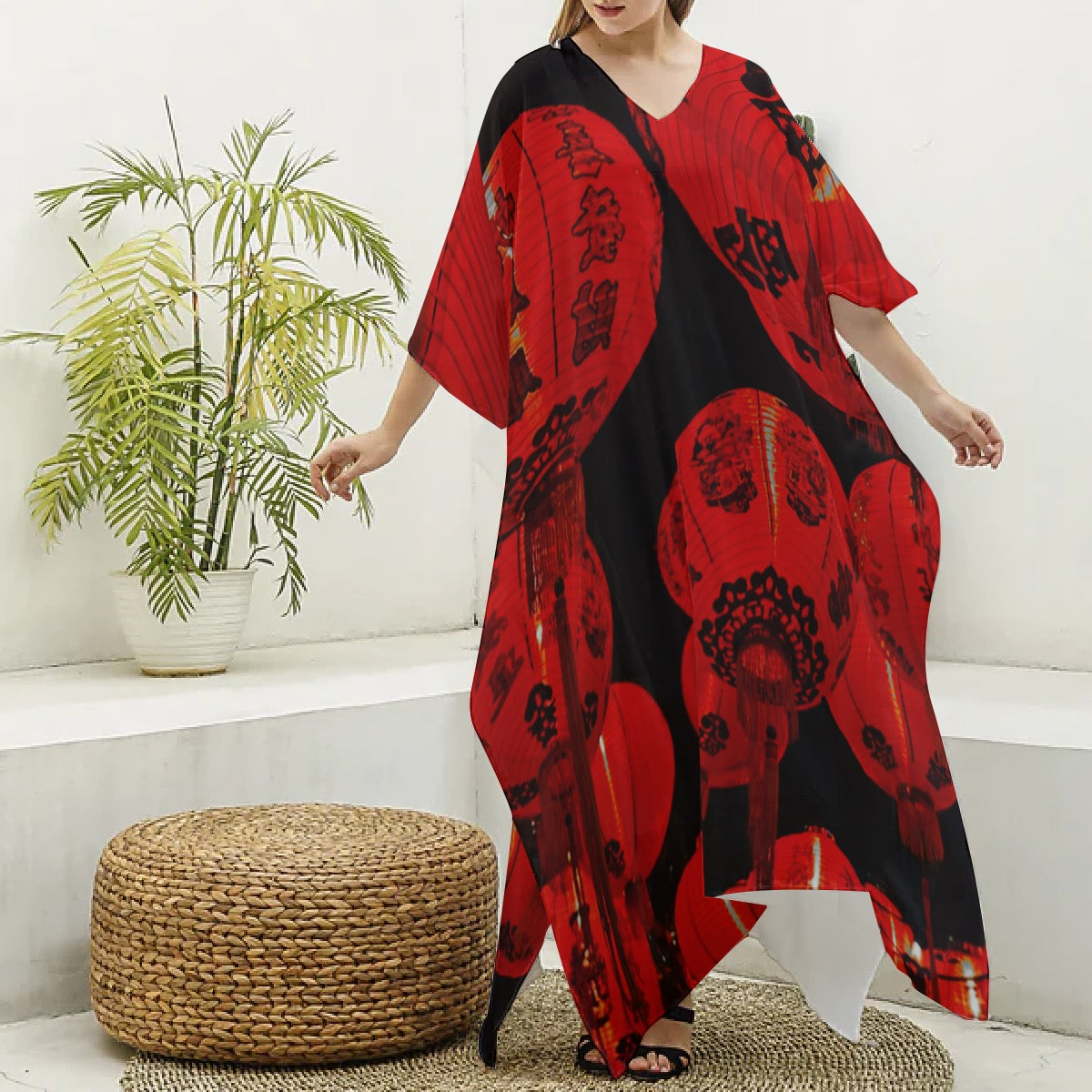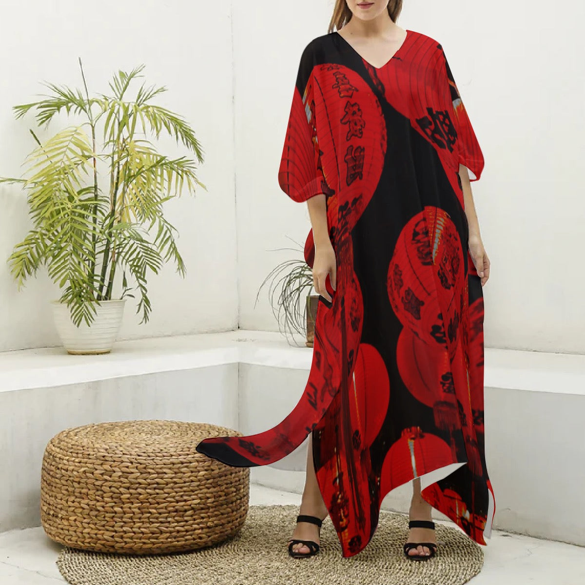 Red Chinese Lantern Women's Imitation Silk V-neck Kaftan Robe